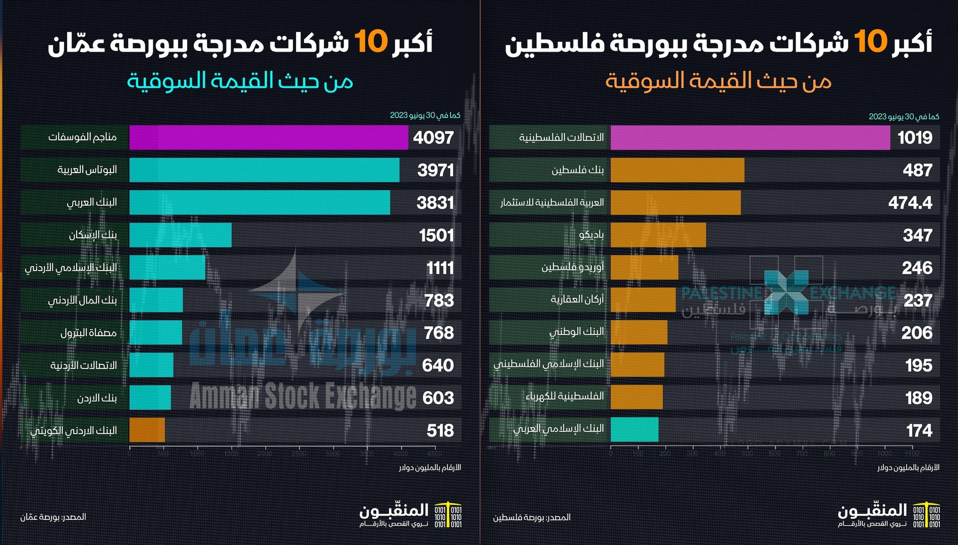 في هذه السطور، تلخص لكم منصة المنقبون، مقارنة بين بورصة عمّان وبورصة فلسطين، كما في 30 يونيو/حزيران 2023، بالاستناد إلى بياناتهم الرسمية.